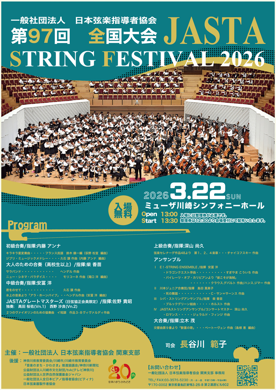 来年の春、3月22日(日)にミューザ川崎シンフォニーホールにて開催されます。 お馴染みの楽しい曲が盛沢山のプログラムからなる、素晴らしい アンサンブルの祭典です。年齢問わず、どなたでもご参加できます。 皆様お誘い合わせの上、是非ご参加ください。 詳しくはFacebookページへ → JASTA STRING FESTIVAL 2026 ↓応募要項は下記クリックして拡大↓ |