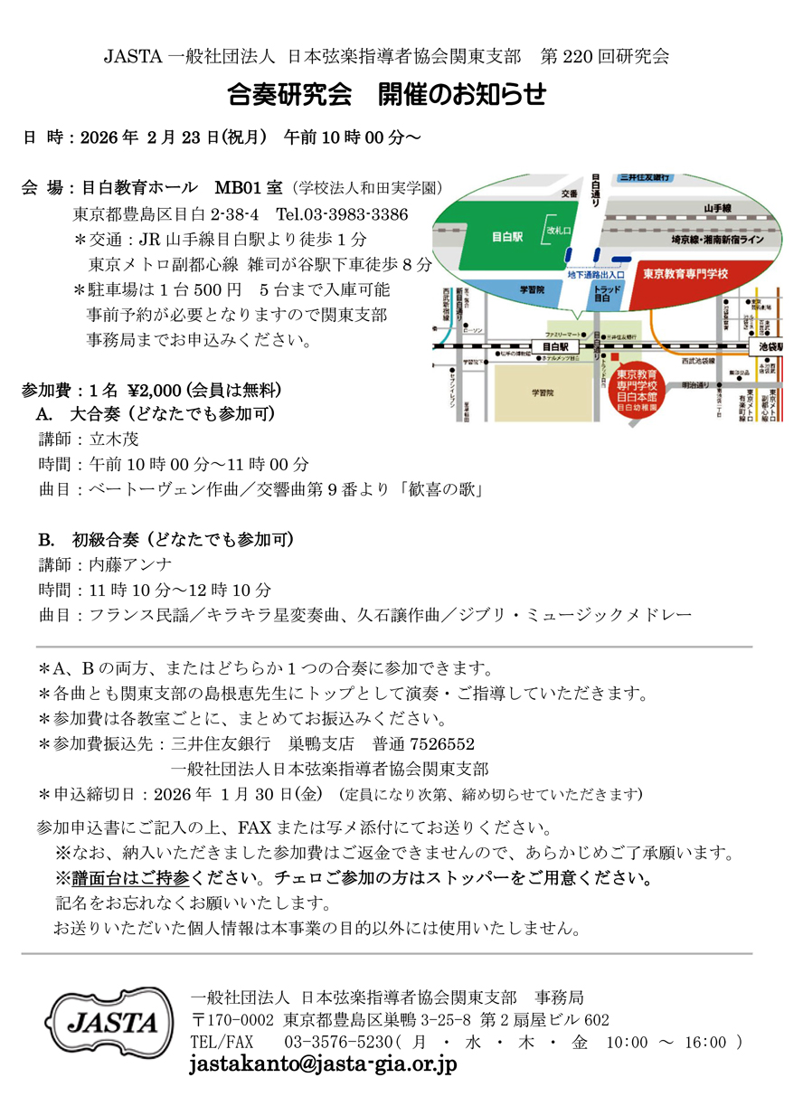 | 日時:2026年2月23日(祝・日) 午前10:00~ ------------------------------------------------------------------ 【 A. 大合奏 】講師:立木茂 ・ ベートーベン作曲 / 交響曲第9番より「歓喜の歌」 【 B. 初級合奏 】講師:内藤アンナ ・ フランス民謡 / ラキラ星変奏曲 ・ 久石譲作曲 / ジブリ・ミュージックメドレー -------------------------------------------------------------------- 演奏ご指導:島根恵先生 会場:目白教育ホール 参加費:1名2000円(会員は無料) 主催:一般社団法人日本弦楽指導者協会 関東支部 どなたでも参加できますので、皆様お誘いあわせの上、奮ってご参加ください。 詳細はチラシ画像をクリック拡大してご参照ください。→ |