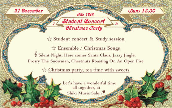 | クリスマス会「第19回 勉強会&親睦会」を開催いたします。 生徒さんが日頃練習している曲を披露するミニ・コンサート、皆で一緒にクリスマス曲を奏でる 楽しいアンサンブル、そして、小さなお子様から大人の方々まで、ご家族の方々も一緒に お茶や美味しいケーキを頂きながら交流していただく親睦会を企画しております。 普段、塾や受験勉強で忙しいお子様方を励まし合い、毎日お仕事で忙しい大人の方々や、 いつも温かく見守っているご家族の方々の気分転換他、皆様で交流しながら、 音楽を通じて、楽しいクリスマスのひと時を過ごしていただければ幸いです。 |